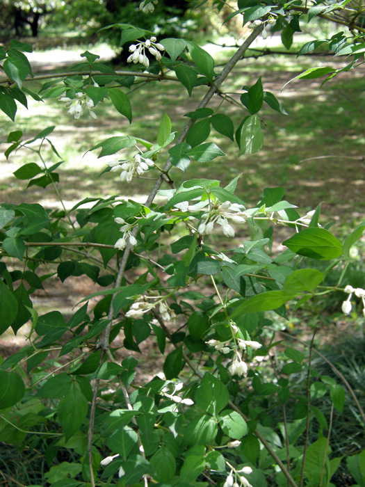 | 形態 | 幹は斜上し、根元から分枝して株立ち状になる。樹皮は灰褐色で、縦に割れ目が入る。葉は3出複葉で、対生する。小葉は先が尖った楕円形で、細かい鋸歯がある。葉柄や主脈は赤味を帯びることも多い。5月頃、枝先に円錐花序を作り、白い花を咲かせる。花弁に見えるのは萼片で、花弁は筒状になって平開しない。花には芳香がある。果実は2室の蒴果で、扁平で先端が尖った矢筈形で表面には皺がある。種は倒卵形で、光沢がある明るい黄褐色。 |