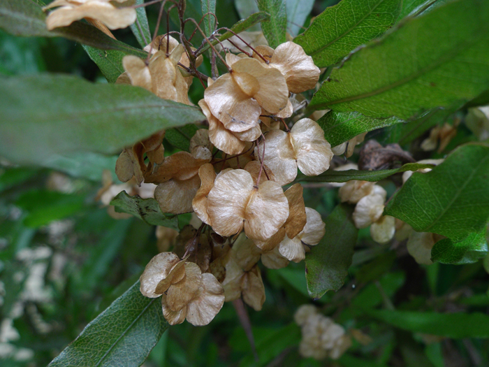 | 形態 | 下の方からもよく分枝し、楕円形の樹形を作る。葉は光沢がある緑色で、全縁の長楕円形で互生する。3~4月頃、短い円錐花序を作り、目立たない黄緑色の花を咲かせる。花は雄花と雌花と両性花があり、雌雄異株のものと雌雄同株のものがある。雄花は雄しべ8本ほどが丸くつき、雌花は長く白い花柱が伸びる。果実は翼果で、扁平な3個の翼が合わさった形で種子1~2個を含む。5~6月頃から、黄緑色~ややピンクを帯びた果実が花のように大量にぶら下がり、7~8月頃には、熟して茶色になる。 |
