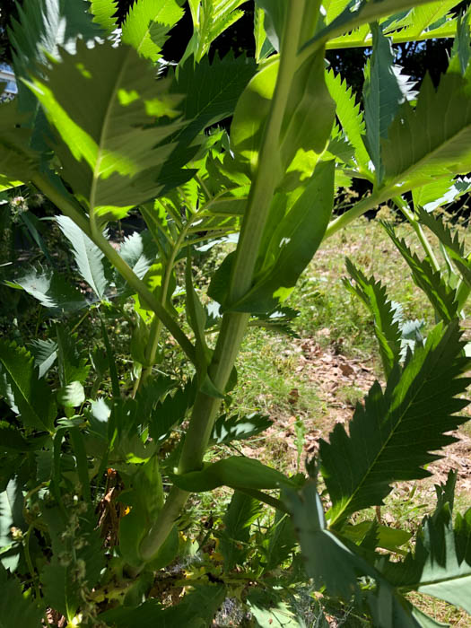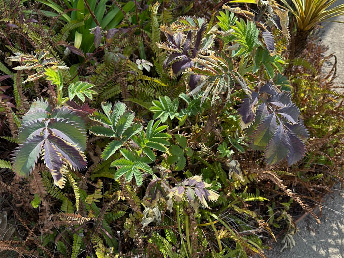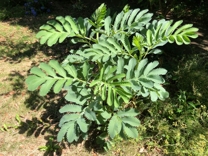 | 形態 | 茎は柔らかく中空で直立、株立になる。葉は青緑色~青灰色で、下面は粉白を帯び、触ると悪臭があり、小葉5〜10対+1枚からなる奇数羽状複葉で、葉軸には翼があり、互生する。小葉は長卵形~楕円形で、しばしば主脈に沿って二つ折りになり、規則的なギザギザの鋸歯がある。春〜初夏に茎頂に総状花序を作り、濃い海老茶色~赤錆色の花を咲かせる。花序柄と萼片は同色で、萼片が目立ち、花弁は非常に小さい5弁花で萼片に隠れる。花は成熟すると、花柄が180度ねじれて、上下逆さまになる。 |