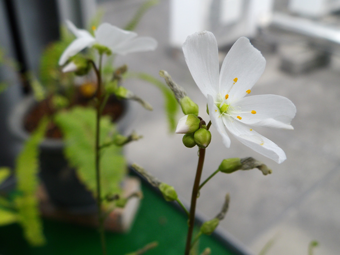 | 形態 | 根から出る葉が放射状に広がる。葉は細く、途中で二股に分かれる。葉の表面には多数の赤い腺毛があり、そこから粘液が分泌され、捕虫する。5~7月頃、長い花茎を伸ばして白い5弁花を十数個、次々と咲かせる。 |