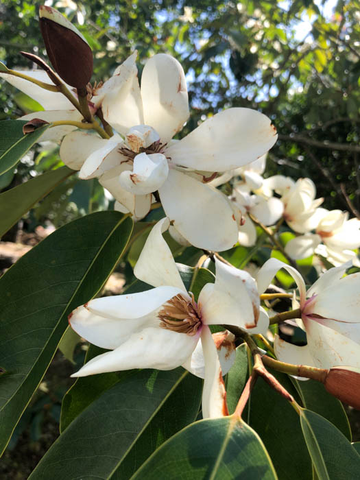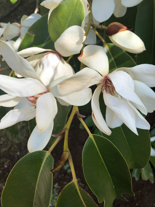 | 形態 | 樹皮は灰白色。枝は赤味がかった毛で密に覆われる。葉は暗緑色で薄めの革質で、先が尖った狭楕円形〜狭倒卵形で全縁。3月頃葉腋に1個、白色で芳香がある花を咲かせる。花被片は12枚。 |