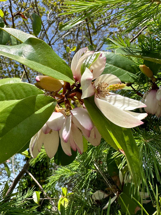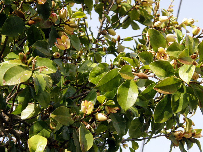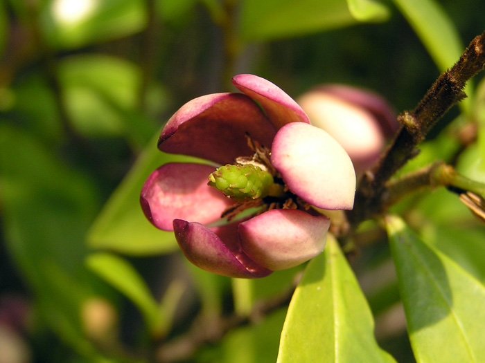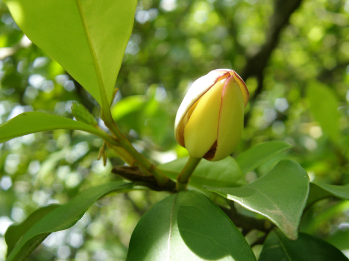 | 形態 | 主幹が立ち、よく分枝し、球形の樹冠を作る。枝や蕾にビロード状の毛がまばらに生える。葉は先が尖った長楕円形〜長倒卵形で、全縁で、厚く光沢があり、葉柄があり、互生する。2~4月頃、葉腋に1個、花を咲かせる。花は縁が紅色を帯びたすすけたクリーム色で、半開状態で、花被片は6枚で、中央部にたくさんの雄しべが放射状に広がる。花にはバナナのような強い芳香がある。果実は袋果が集まった集合果で、秋に赤く熟し、赤色の仮種皮に包まれた種子が糸で垂れ下がる。 |