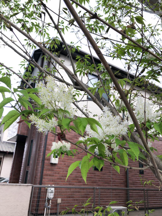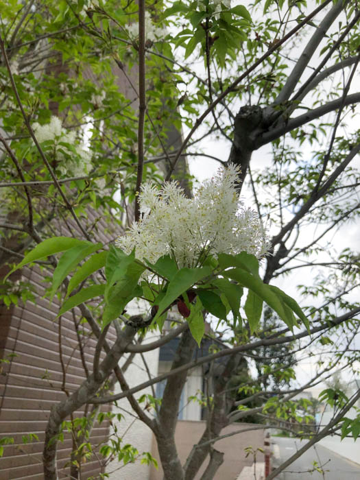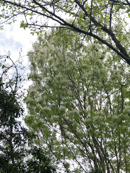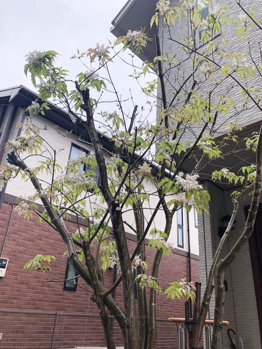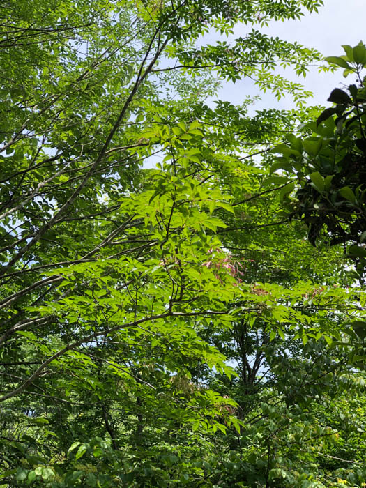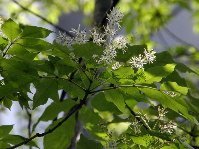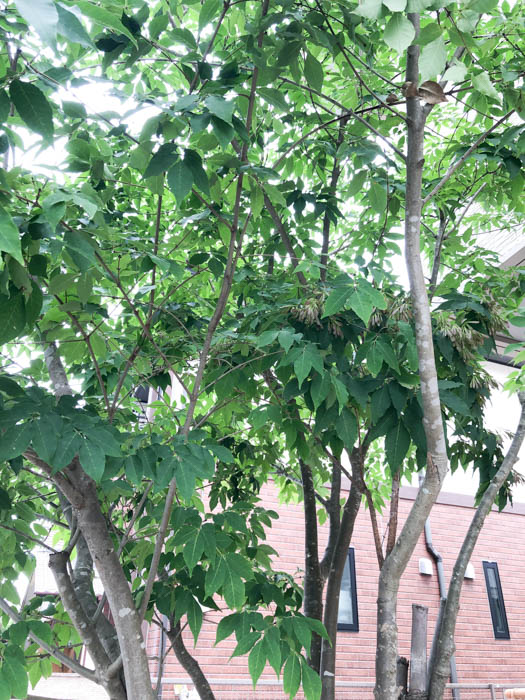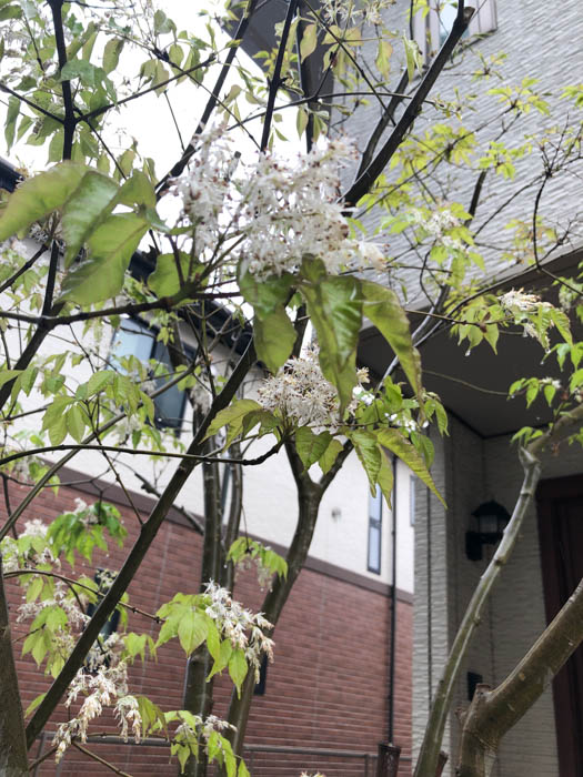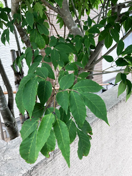 | 形態 | 成熟した木の樹皮には地衣類が付着し、独特の灰緑色の斑点模様ができる。葉は通常小葉2対+1枚からなる奇数羽状複葉で、対生する。小葉は先が尖った楕円形で、細かい鋸歯がある。5月頃、枝先に円錐花序を作り、白い小花を多数咲かせる。花弁は4枚で細長い。果実は膜状の羽根を持つ倒披針形の翼果で、臙脂色→茶褐色に熟し、風で遠くまで飛ぶ。 |