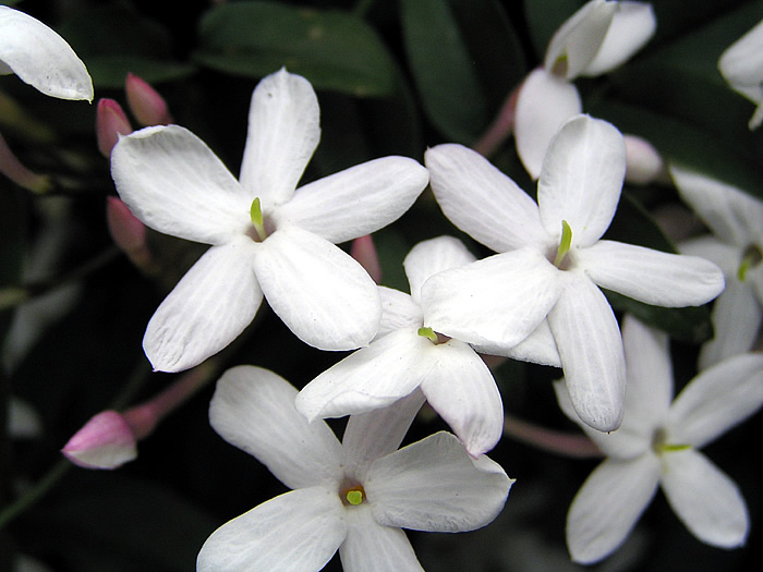 | 形態 | 茎は軟弱で、他物に巻きつきながら生育する。葉は小葉2〜3対+1枚からなる奇数羽状複葉で、対生する。小葉は先が尖った長楕円形で、全縁。3~4月頃、茎頂に散房花序を作り、花を30~40個咲かせる。花は外側が紫がかった桃色で内側は白いので、蕾がピンク、花が白に見える。花は筒状で、先端が5裂し、平開する。花には強い芳香がある。多花性で、株全体が花に覆われる。 |