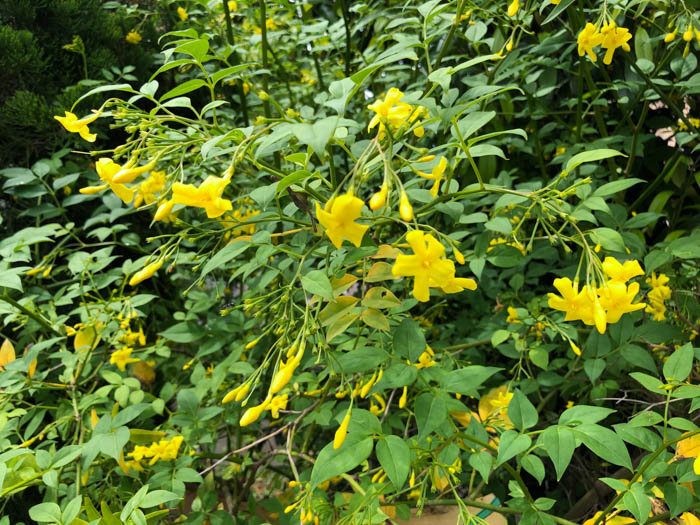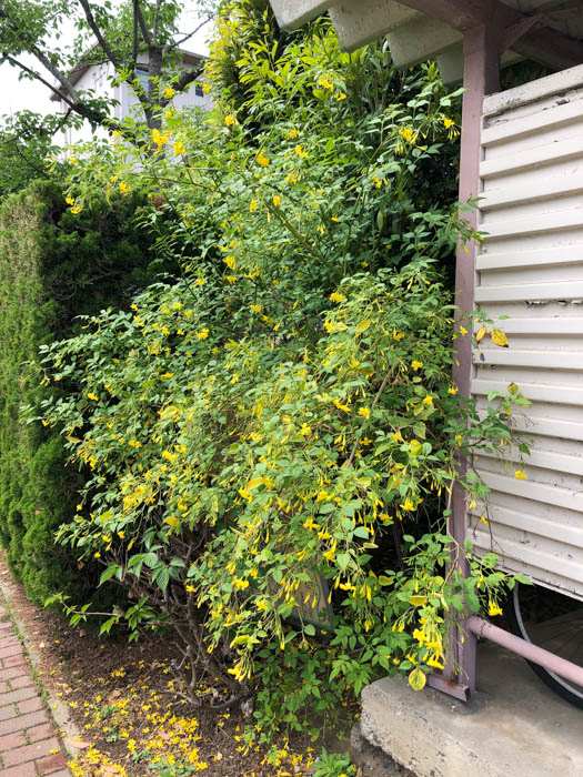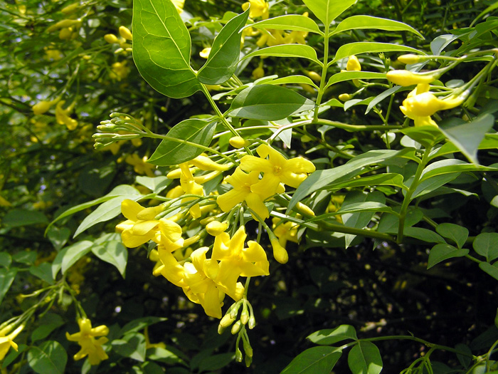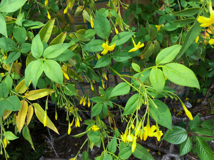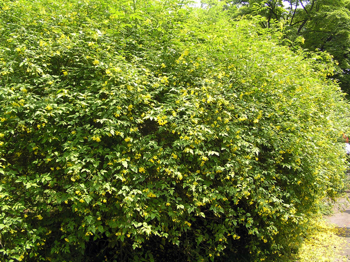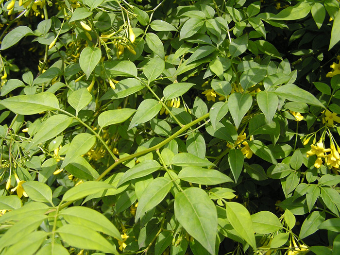 | 形態 | 地際から株立ちになり、先端は枝垂れる。葉は小葉1〜3対+1枚からなる奇数羽状複葉で、互生する。小葉は先が尖った卵形で、全縁。5~6月頃、茎頂に散房花序を作り、黄色い花を8~20個咲かせる。花は筒状で、先端が5裂し、平開する。花には芳香が無い。 |