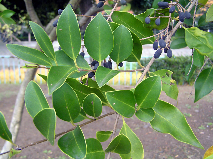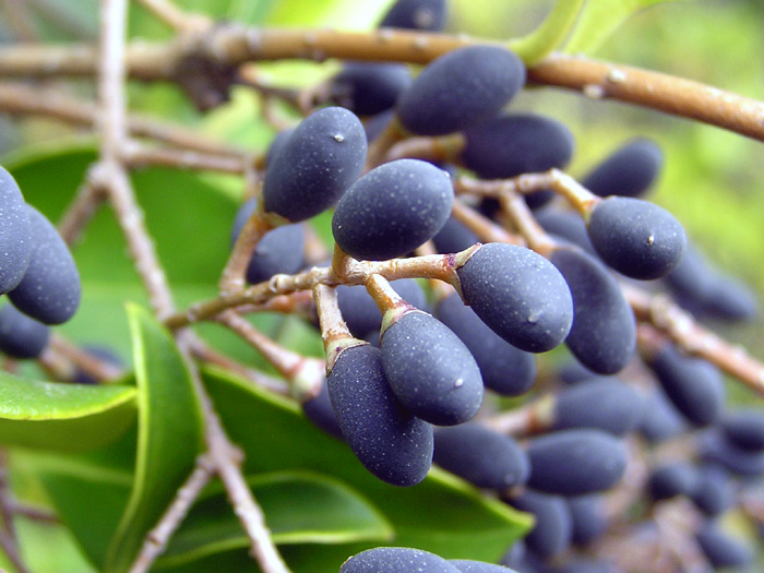 | 形態 | 主幹を立てるが、基部から多くの枝を出す。樹皮は灰褐色で皮目がある。葉は表面にやや光沢があり、先が尖った卵形で、全縁で、対生する。5〜6月頃、1年枝の先に円錐花序を作り、白い花を咲かせる。花冠は4裂して裂片が反り返る。雄しべは2本で花冠から長く突き出る。葯は赤味がかった薄茶色。花には香りがある。果実は長球形で、10月~翌2月頃に粉っぽい黒紫色に熟す。 |