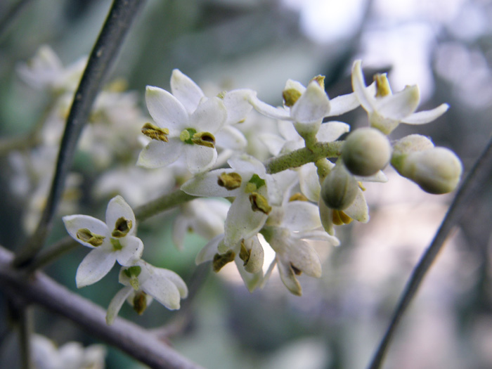 | 形態 | 主幹はあまり高くならず、枝先はやがてやや垂れ下がるようになる。葉は厚く、細い楕円形で、表は緑色、裏は鱗片が密生して銀白色を帯びる。5~6月頃、花枝を伸ばし、やや黄色味を帯びた白色の、芳香のある花を咲かせる。花冠の先端は4つに分かれ、2本の雄しべが熟して花粉を散布した後、中央部から雌しべが出てくる。果実は石果で、10~12月頃、黒色に熟す。 |