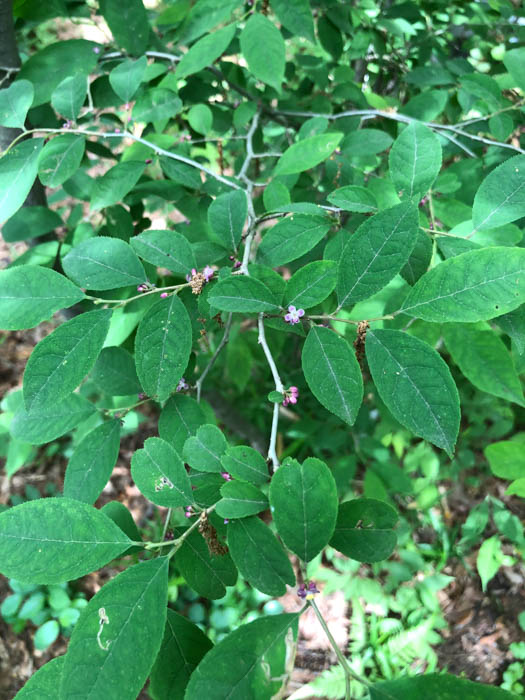 | 形態 | 樹皮は暗褐色。枝は細く、よく分枝する。葉は先が尖った楕円形〜卵状楕円形で、両面に毛があり、細かい鋸歯があり、互生する。6月頃、本年枝の葉腋に、雄花序には5〜20個、雌花序には2〜4個の薄赤紫色の花を咲かせる。花弁と雄しべは4〜5個。雄花には雄しべがつき、雌花には退化した雄しべがある。子房は球形で、花柱はごく短い。果実は球形の核果で、9〜10月頃、赤く熟し、落葉後も残る。 |