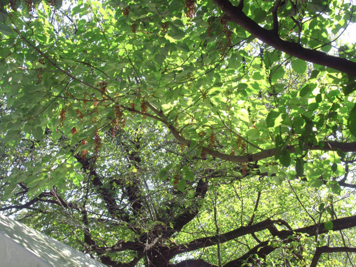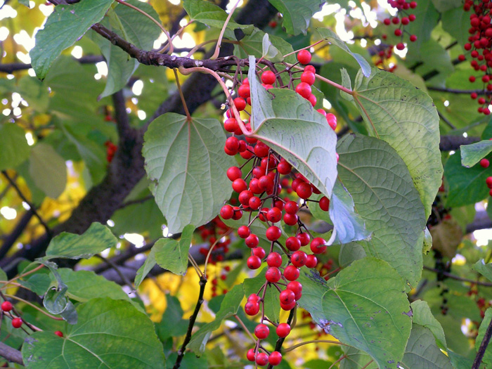 | 形態 | 幹は直立し、大きな枝が1ヵ所から放射状に出る。樹皮は灰褐色で、小さな皮目がたくさんある。葉は先が尖った卵形で、粗い鋸歯があり、葉柄は長くて赤っぽい。葉柄には腺点がいくつかちらばる。5月頃、枝先に円錐花序を下垂させ、芳香がある花をたくさん咲かせる。花に花弁はなく、黄緑色の萼片5~6個がある。雄花は雄しべ多数が放射状につき、雌花の子房は球形で、3~6個の花柱があり、退化した雄しべがある。果実は球形の液果で、10~11月頃橙赤色に熟し、落葉後も残る。 |