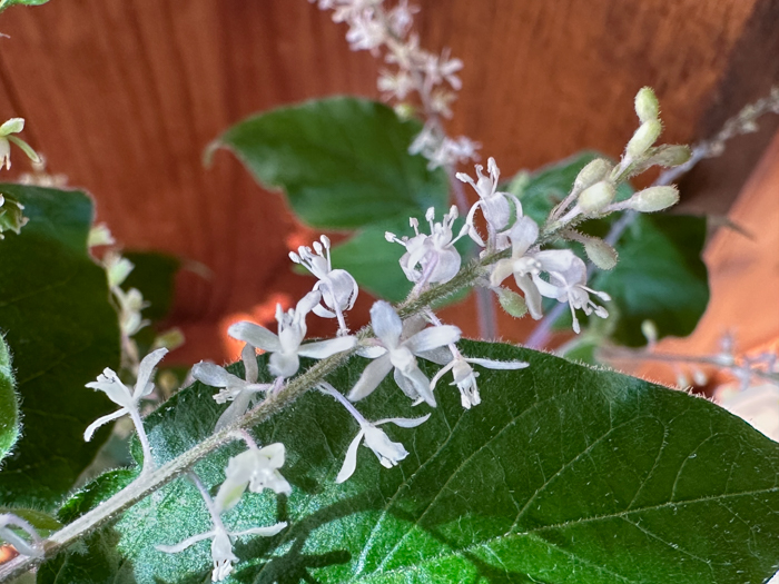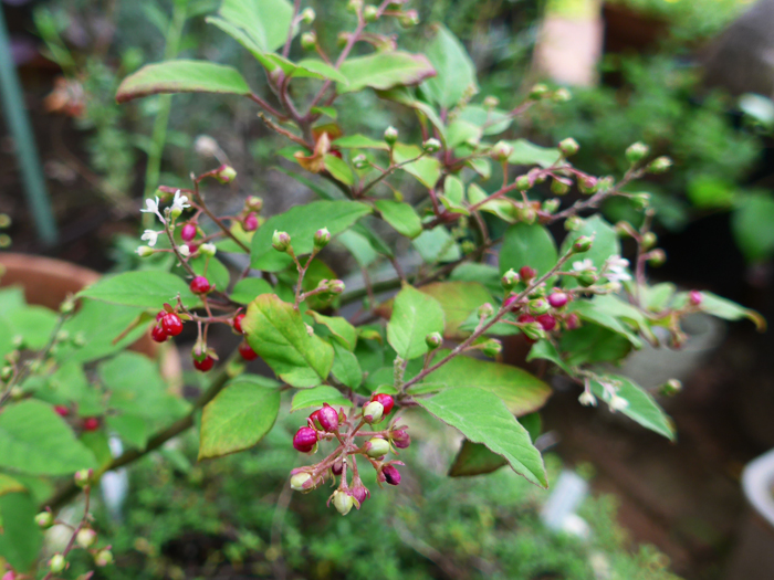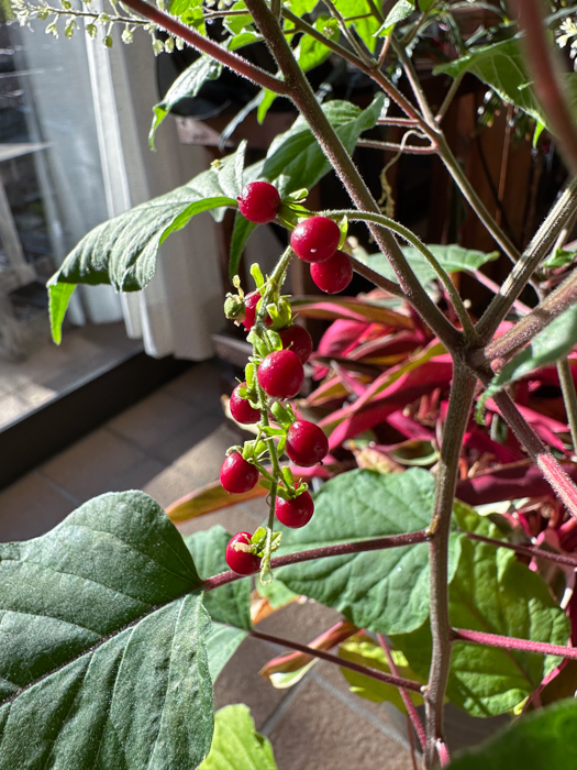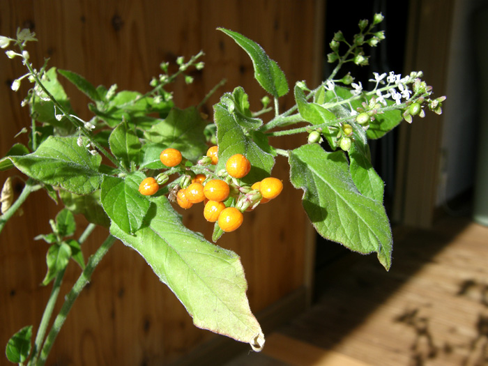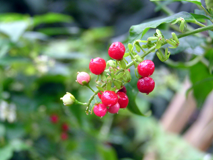 | 形態 | 茎は直立し、株元から分枝し、根際は木質化する。熱帯~亜熱帯地域などでは茎が長く伸び、他物に寄りかかって成長する。葉は先が尖った長卵型で、縁がやや波打ち、互生する。生育適温では周年花が咲き、続いて実がなる。総状花序に白~薄桃の花が多数咲く。花弁に見える部分は萼。果実は液果で、鮮やかな赤色に熟す。 |