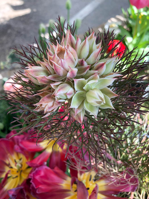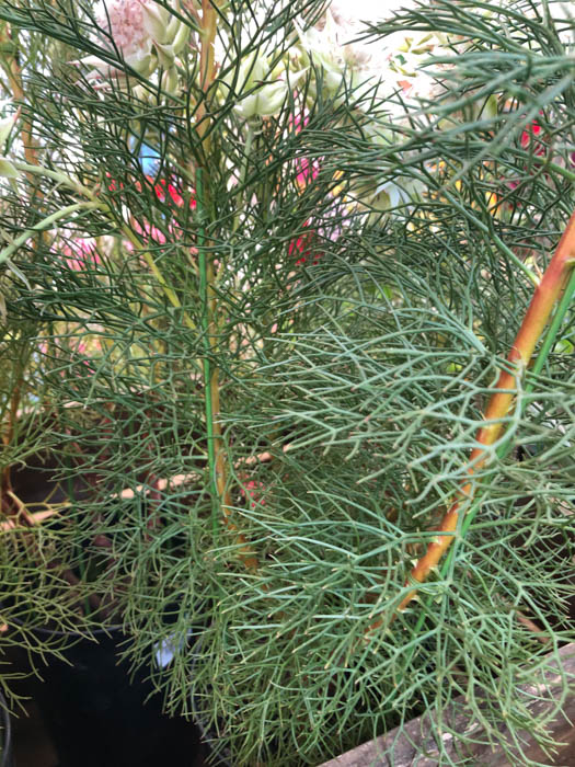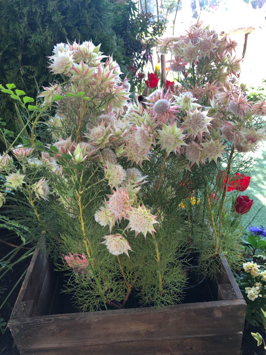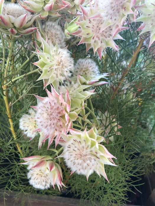 | 形態 | 幹は直立する。葉は1~2回羽状複葉で、裂片は細い円筒形。冬〜春頃、枝先にピンクがかった白色の頭状花を咲かせる。頭状花は花弁に見える大きな苞に囲まれる。苞は先が鋭く尖った披針形~卵状披針形で白色。 |