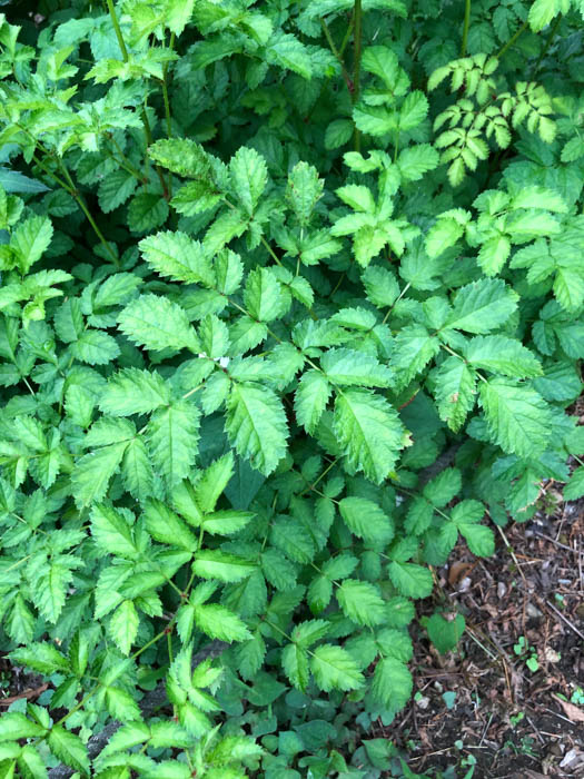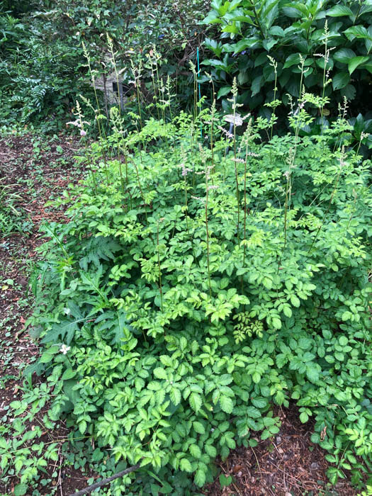 | 形態 | 地下に太い根茎がある。葉は根茎から根生する。根生葉は2~4回羽状複葉。小葉は明緑色で、先が尖った広卵形で、基部はハート形で、重鋸歯がある。春に花茎を立ち上げる。花茎には3回3出複葉の茎生葉が互生する。6~8月頃、花茎の頂に総状花序を作り、白色~淡紅色の花を咲かせる。花序は密で盛んに分枝する。花弁はさじ形で、雄しべは10個。 |