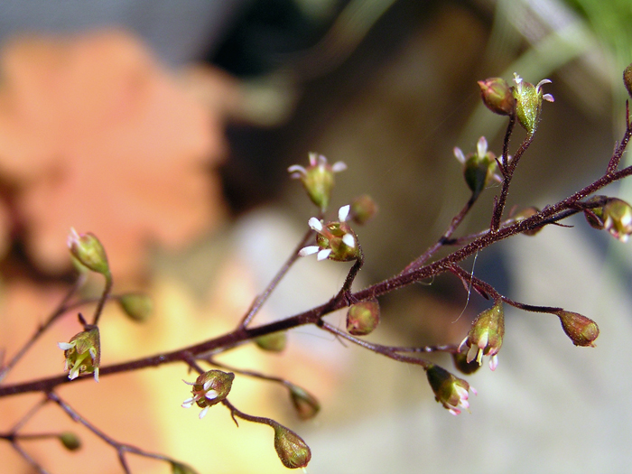| 特徴 | 葉色は小豆色。花柄および萼も小豆色。花はごく小さい白い花弁が5枚つく。 |