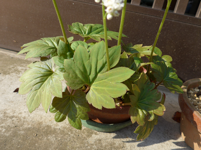 | 形態 | 太い根茎が浅い地中~地表部を這って繁殖する。葉は根生で長い葉柄があり、叢生する。葉身は心円形で、掌状に5~9裂し、細かい鋸歯がある。葉の展開とほぼ同時に花茎を立ち上げ、総状または円錐花序を作る。花のように見えるのは白い萼で5裂し、小さい白い花弁が5枚ある。雄しべの葯は臙脂色。蕾が赤くなる場合が多い。晩秋には地上部が枯れて、休眠する。 |