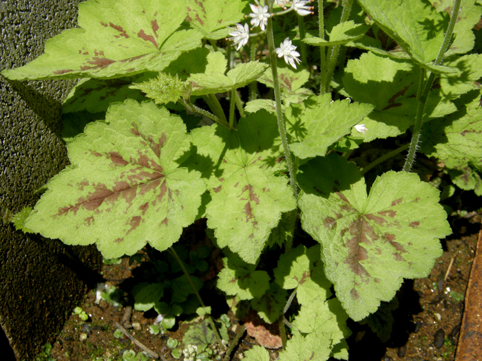 | 特徴 | 匍匐、下垂性。葉は掌状に浅く切れ込みが入り、緑色で、赤褐色の脈が入る。4〜6月頃、白花をたくさん咲かせる。 |
