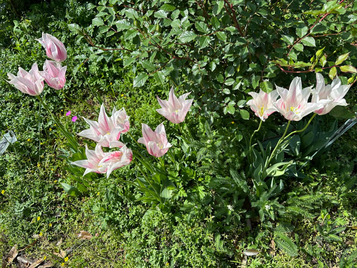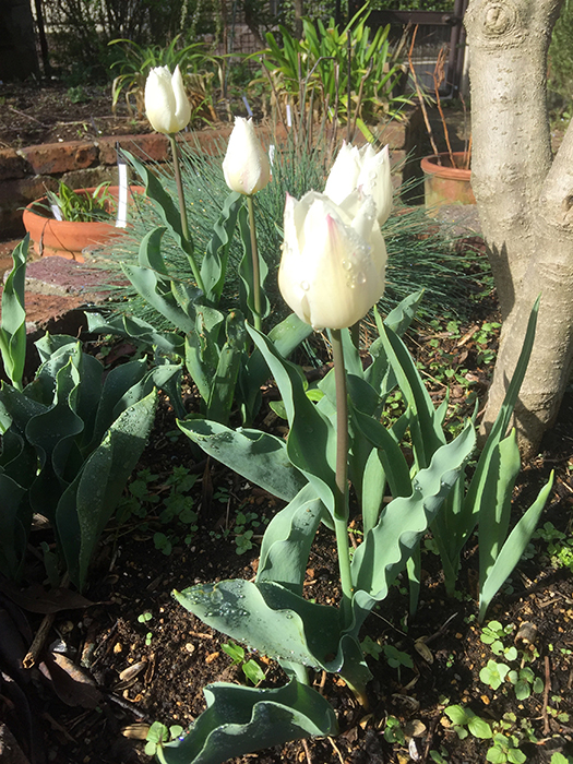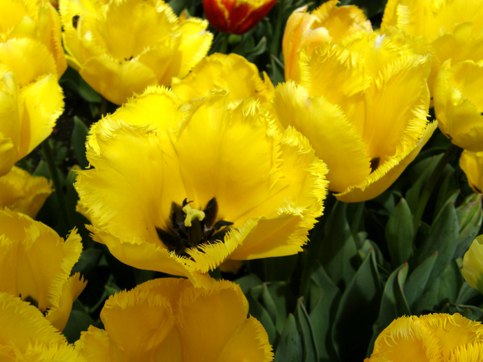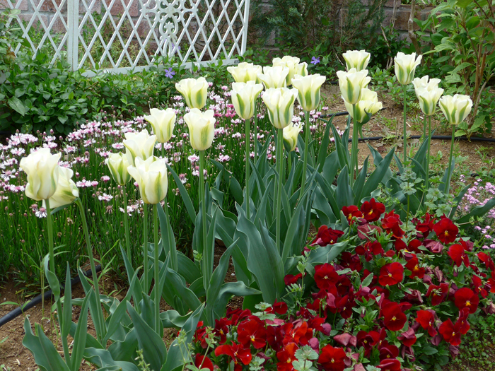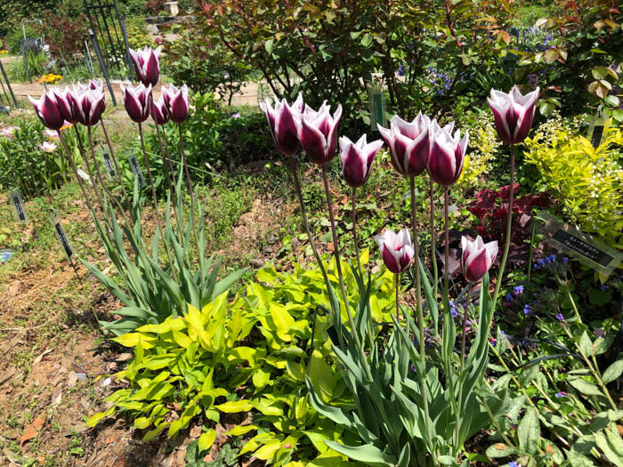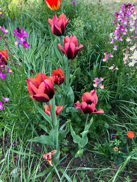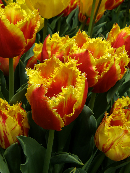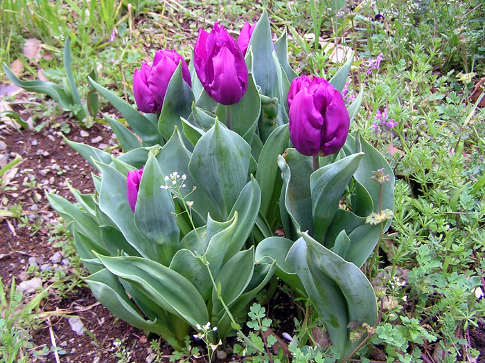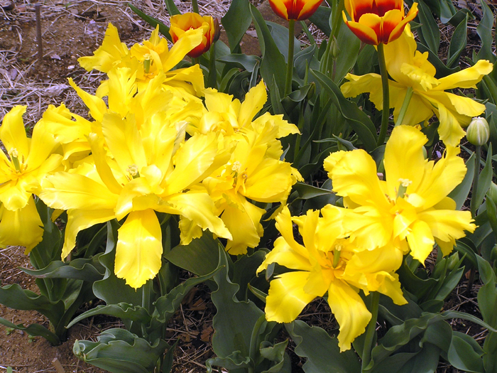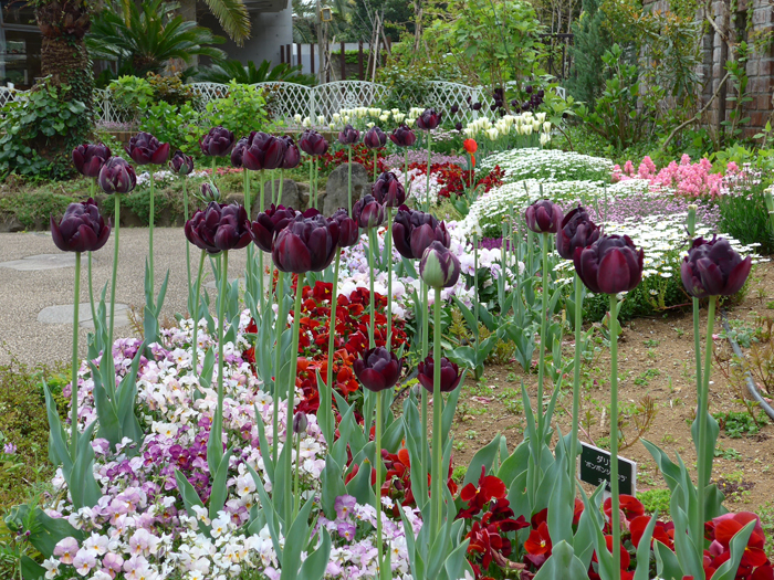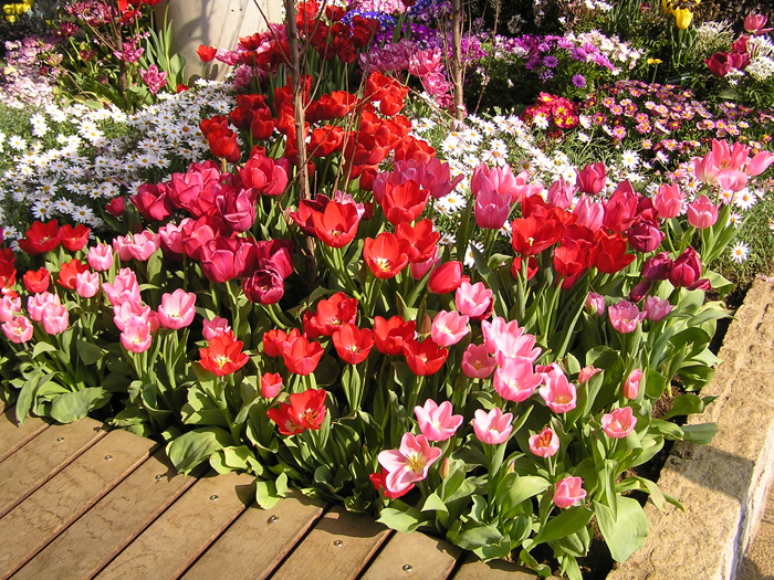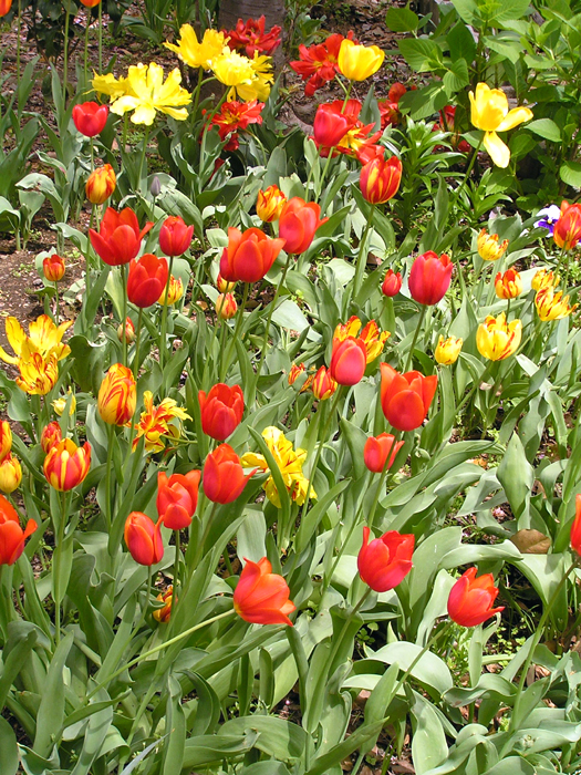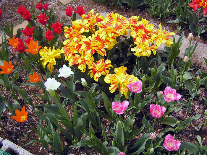 | 品種 | 多数の園芸品種がある。4月中旬に咲く早咲き、4月下旬~5月上旬に咲く晩咲き、その中間型がある。花の咲き方には、一重咲き、八重咲き、ユリ咲き、パーロット咲き、フリンジ咲き、枝咲きなどがある。花色は赤、黄、白、桃、青紫、暗紫色、橙、緑、黒、複色など。 |