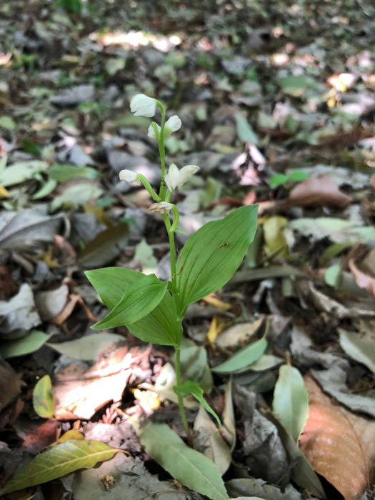 | 形態 | 葉は広披針形〜先が尖った狭楕円形で平行脈が何本もあり、花茎を抱き、3〜6枚が互生する。4〜6月頃、茎頂に総状花序を作り、白色の花を数個咲かせる。花は斜め上向きに咲くが、平開せず、すぼまったまま。唇弁の基部に短い距がある。 |