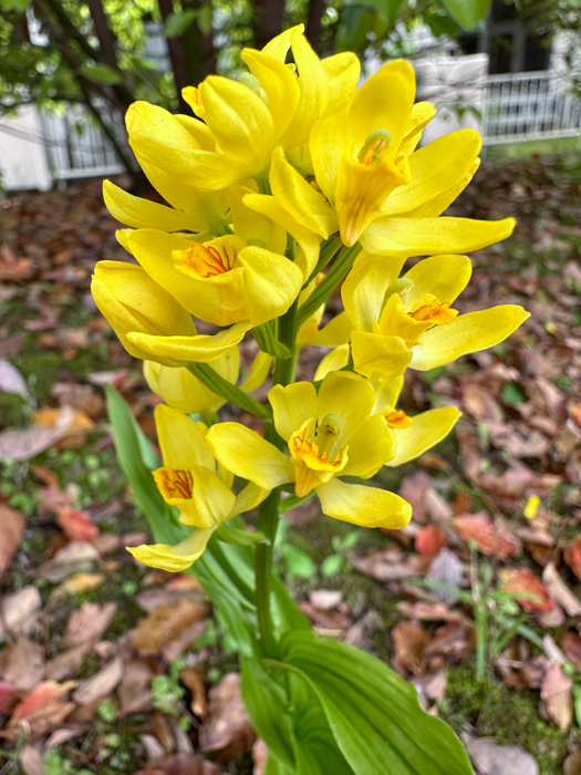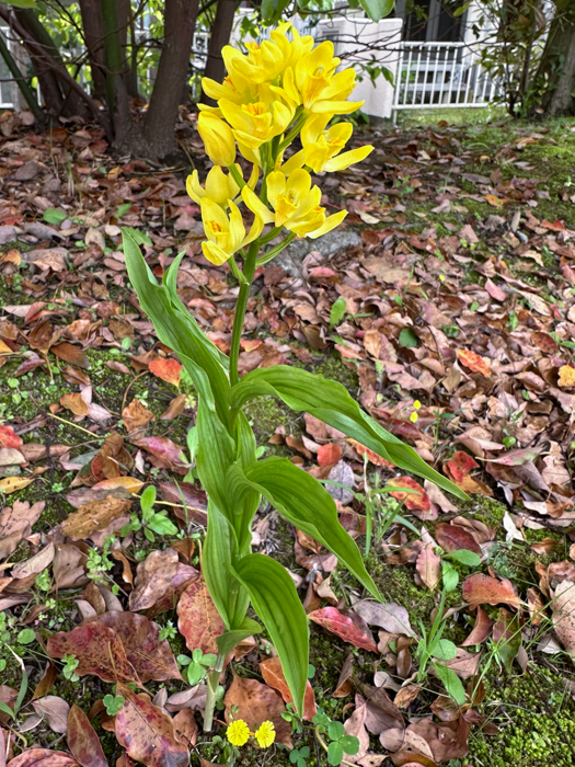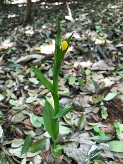 | 形態 | 葉は広披針形で平行脈が何本もあり、花茎を抱き、互生する。4~6月頃、茎頂に総状花序を作り、黄色の花を数個咲かせる。花は上向きに咲き、花冠は明るい時に開く。唇弁の基部に短い距がある。 |