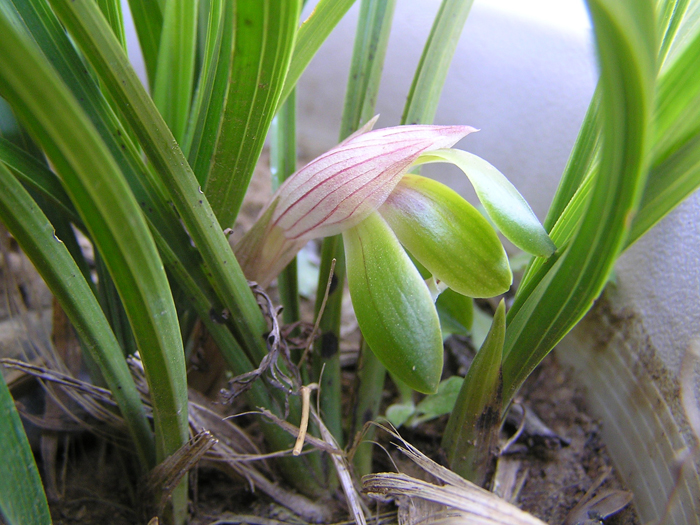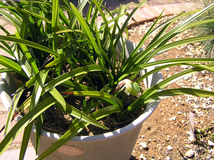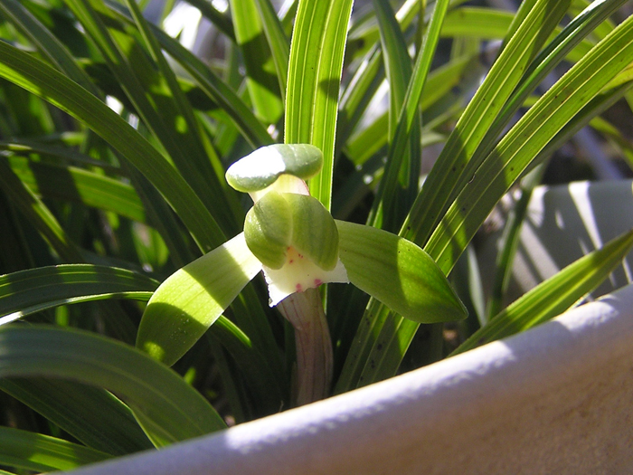 | 形態 | 葉は細長く、地際から叢生する。ごく細かい鋸歯があってざらつく。根は太くて長い。3~4月頃、根元から葉の陰に花茎を伸ばし、横向きに花を咲かせる。花茎は薄膜状の鱗片にゆるく包まれる。花は黄緑色~緑色。果実は紡錘形で、上向きに直立する。種子はきわめて小さい。 |