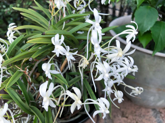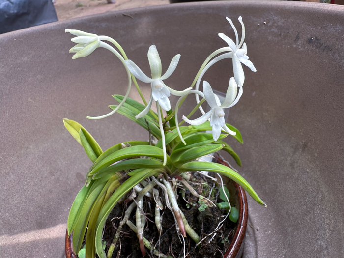 | 形態 | 茎は短く、根元近くでまばらに分枝する。茎の基部から多くの太い気根をだして、樹皮や岩などに着生する。葉は広線形で、肉厚で堅く、密に2列互生する。6〜8月頃、茎の基部の葉の間から花茎を出し、総状花序を作り、花を咲かせる。花は白色で紫味を帯び、芳香があり、特に夜間に香る。非常に長い距がある。 |