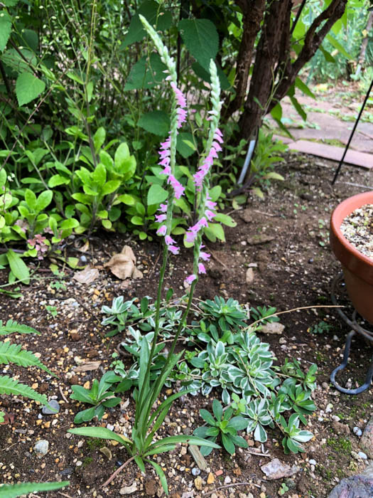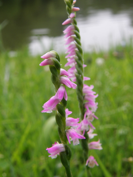 | 形態 | 秋、地際から広披針形の葉が数枚出て、冬を越す。5~8月頃、葉はやや長く伸び、花茎を立ち上げ、螺旋状に小さな花をつける。ねじれは左巻きも右巻きもある。桃色の花被片5が半開し、白い唇弁はフリル状になる。果実は紡錘形の蒴果。花後は葉が枯れて休眠し、秋に新芽が出る。 |