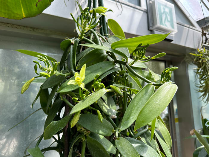 | 形態 | 葉は肉厚で、先が尖った長卵形で、軟弱な茎の節ごとに互生する。各節からは気根が出て、それで樹木や他物に付着して、よじ登り成長する。成長後は根は無くても気根があれば生育できる。成熟すると葉腋から短い花茎を出し、総状花序を作り、基の方から順に花を咲かせる。花は淡緑色で、トランペット状に開き、朝に咲き、夕方には萎む一日花で、香りは無い。果実は細長い円筒形で、緑色→黄色→紫褐色に変わる。完熟するまでには半年ほどかかる。鞘の中には非常に微細な黒色の種子が無数に含まれている。 |