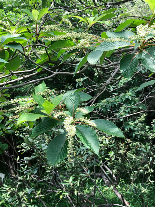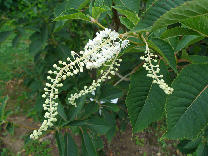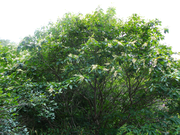 | 形態 | 樹皮は茶褐色で、古くなると不規則な薄片となって剥がれ、滑らかな斑模様になる。枝は輪生状に出る。葉は先が尖った倒卵形で、尖った鋸歯があり、枝先に集まって互生する。6~9月頃、枝先に円錐状の総状花序を作り、小さな白い花を密につける。花冠は深く5裂する。果実は扁球形の蒴果で、褐色に熟す。 |