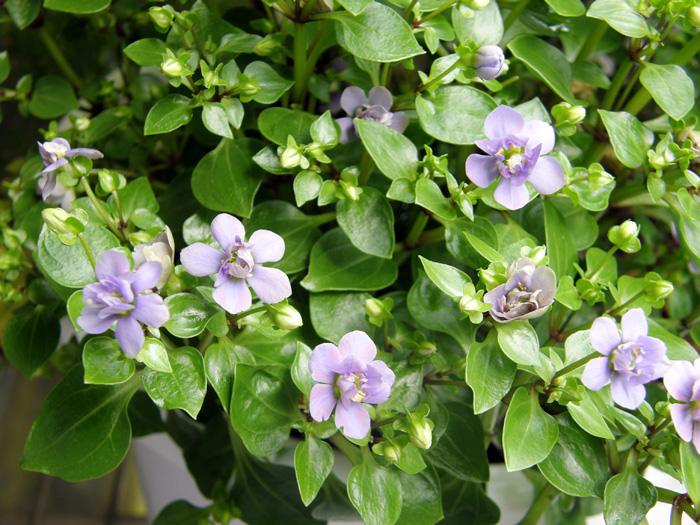 | 形態 | よく分枝してこんもりとコンパクトな球状にまとまる。葉は先が尖った卵形で、表面に光沢があり、対生する。6~9月頃、葉腋に芳香がある薄紅紫色の花をたくさんつける。花冠の先は5つに裂けて平開し、 雄しべは5本で、葯は黄色、雌しべは1本で長く飛び出し、先端が鉤状に曲がる。 |