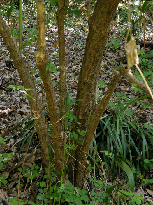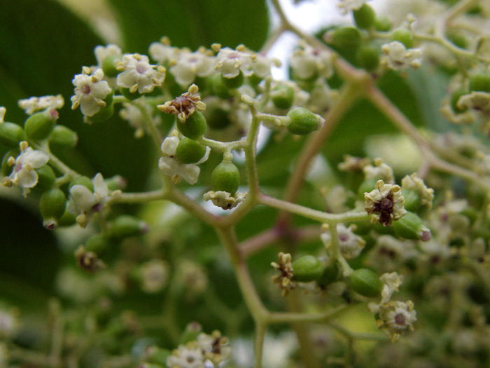 | 形態 | 根元から勢いのある太い茎が出て株立ちとなる。若枝は淡緑色~淡褐色、古枝は樹皮が縦に裂け灰褐色で、コルク質が発達する。葉は小葉2〜4対+1枚からなる奇数羽状複葉で、対生する。小葉は先の尖った長楕円形~広楕円形で細かい鋸歯があり、基部は円形。葉柄の基部には蜜腺がある。4~5月頃、葉の展開と同時に本年枝の先に円錐花序を出し、淡黄白色の小さな花を多数つける。花は薄黄緑色で花冠は5深裂して反り返る。雌しべは赤紫色で先端が3つに分かれ、雄しべは黄色で5本。果実は卵球形で、夏に赤く熟す。 |