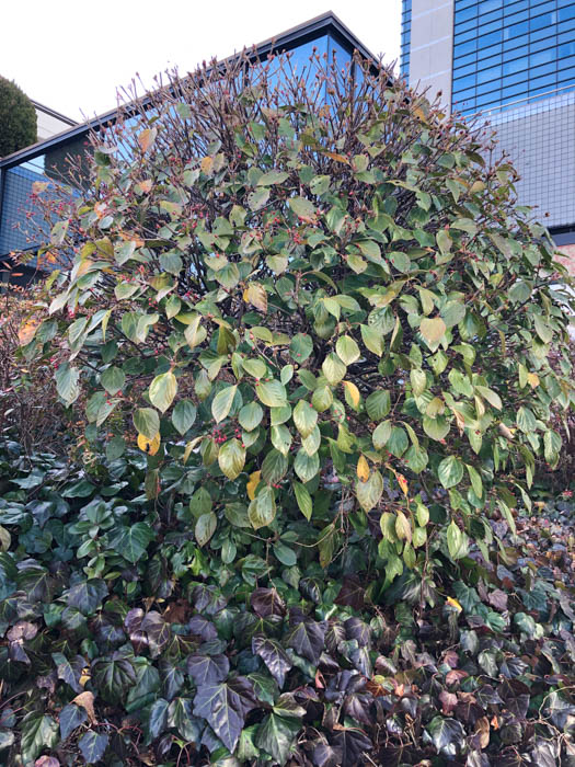 | 形態 | 樹皮は⿊褐⾊。若い枝は緑色で、次第に紫味を帯びる。葉は先が尖った菱状倒卵形~菱状卵形で、基部は楔形、濃緑色で光沢があり、浅い鋸歯があり、葉柄はやや長く、赤紫色味を帯び、対生する。3~5月頃、枝先に散形花序を作る。花は白色の5弁花で、5本の雄しべは花弁よりも短い。花には悪臭がある。果実は長球形の核果で10~12月頃に赤く熟す。葉は寒さで一部紅葉する。 |