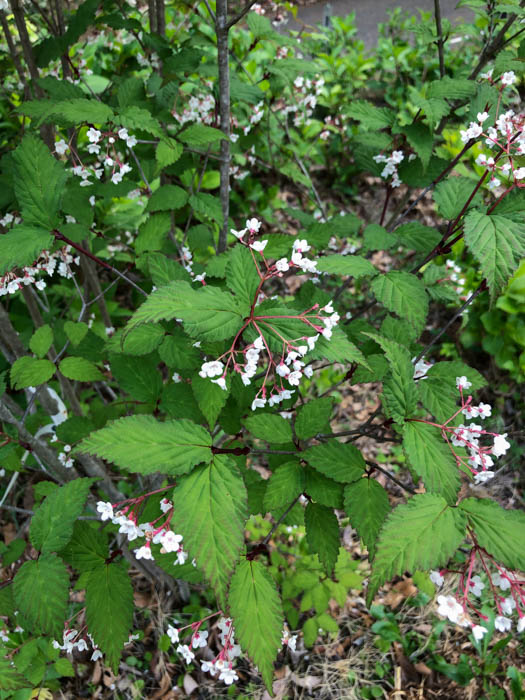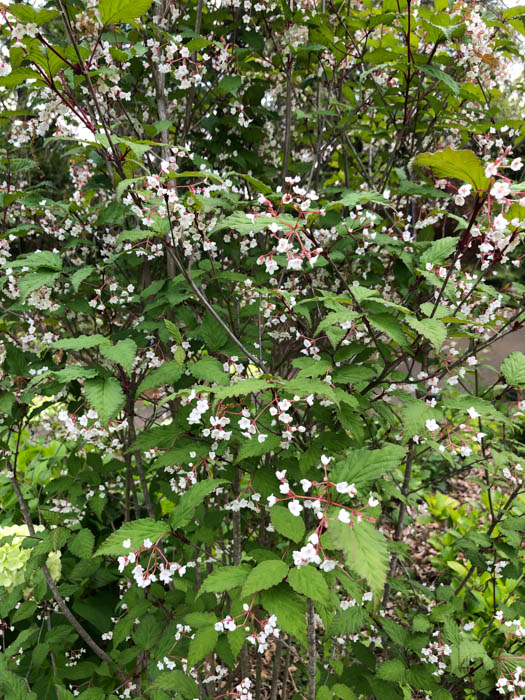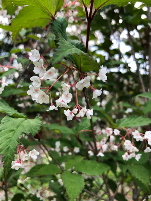 | 形態 | 幹は灰褐色。葉は先が尖った卵形~長卵形で、濃緑色で葉脈が目立ち、粗い鋸歯があり、対生する。4~5月頃、枝先に散房花序を作り、5~10個ほどの淡い紅色を帯びた白い花を垂らすように咲かせる。花冠は5中裂し、裂片の先端は丸い。果実は長球形の核果で、9~10月頃に赤く熟す。葉は、秋には赤く色づき、また、枯れたり傷ついたりすると、黒く変色する。 |