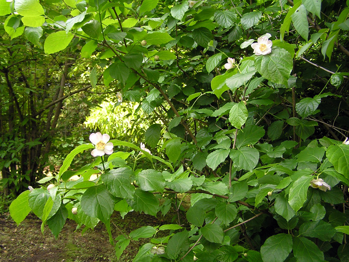 | 形態 | 葉は光沢があり、先の尖った卵形で、全縁で少し波打ち、対生する。5~7月頃、中央が黄色で花弁がピンクがかった白い半八重の花を咲かせる。花弁は倒卵形でやや波打つ。花に芳香はない。花後、花床が膨らみ、偽果になる。 |