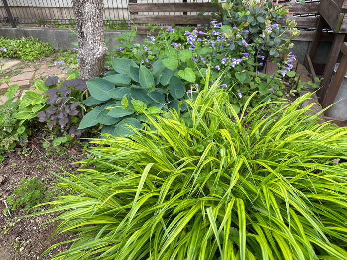 カラーリーフがひときわ鮮やかな季節。手前は黄色い縞斑の風知草。ブルーグリーンのホスタと黒紫色のアスチルベ、‘チョコレートショーグン’、紫色の花はラショウモンカズラ。