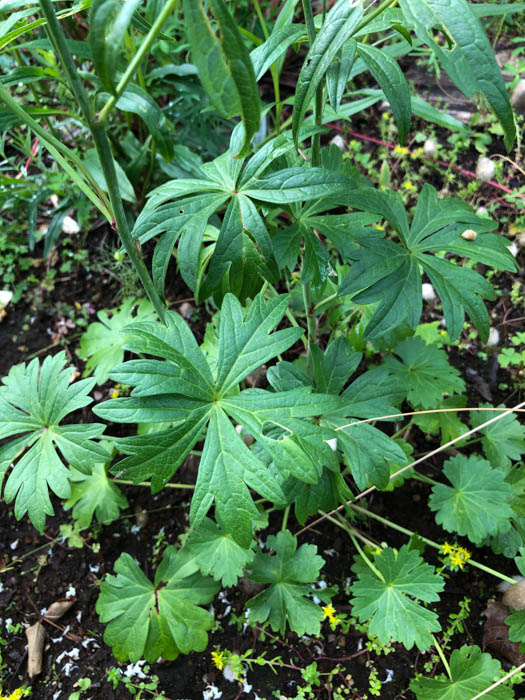| 形態 | 冬季は地際から葉を叢生させて、ロゼット状で過ごす。根生葉は、腎円形で7〜9裂し、裂片は丸く切れ込む。4~5月頃から茎を直立させ、あまり分枝はしない。茎生葉は、下部は根生葉と同様で、上部の葉は掌状に5~7深裂し、全縁またはゆるく大きな鋸歯があり、長い葉柄があり、互生する。6~9月頃、茎頂に穂状花序を作り、白い5弁花を咲かせる。雌しべと雄しべは途中まで合着して柱状になり、長く突き出す。朝開いて夕方には萎む一日花。 |