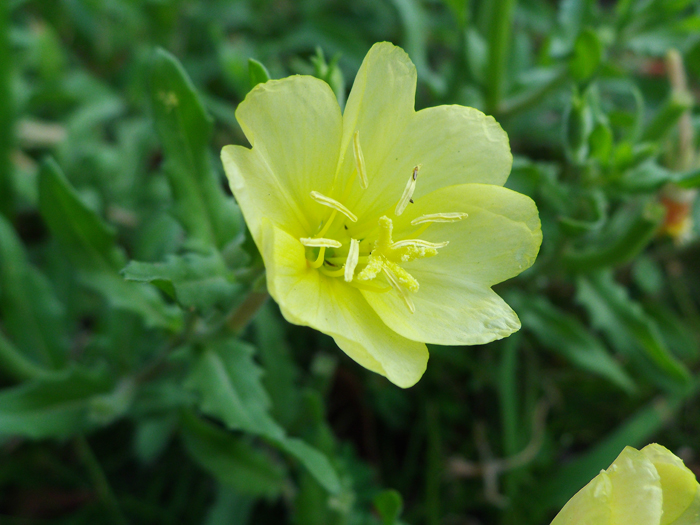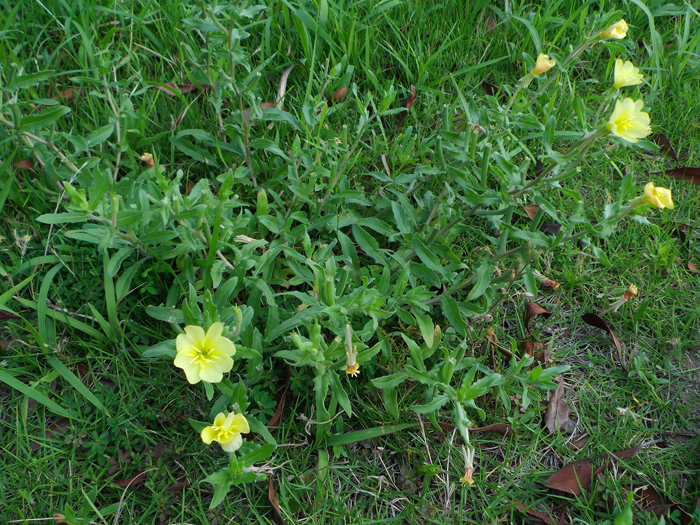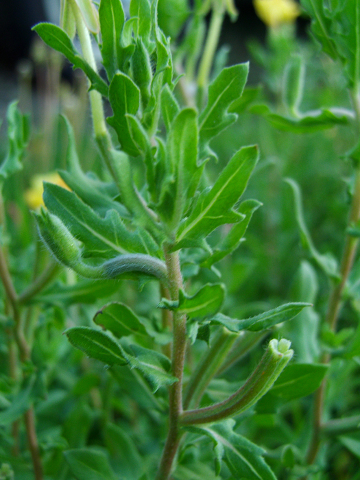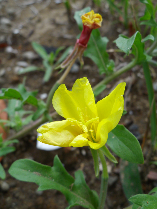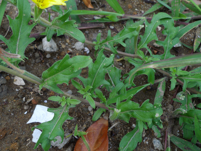 | 形態 | 秋に発芽し、ロゼット状で越冬する。茎は地面近くを這うように伸びる。葉は互生し、葉柄はない。細く長く、縁が深く羽状に裂けたものから、ほとんど裂けないものまでさまざまで変化が多い。花期は5~10月で、夕方開花し、翌朝にしぼむ。しぼんだ花は赤っぽく変色する。 |