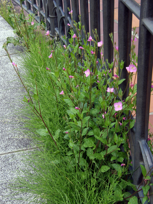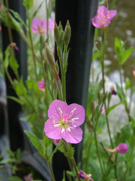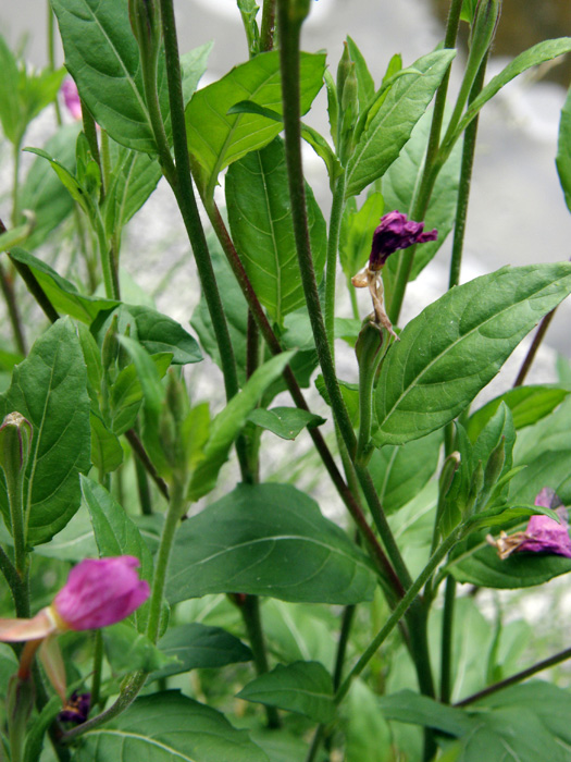 | 形態 | 茎には柔毛があり、地際からたくさん立ち上がって株立ち状になる。葉はやや広い披針形で、ごく目立たない鋸歯があり、互生する。5~9月頃、茎上部の葉脇から桃色の花をつける。花弁は4枚で濃桃色の脈があり、中心部は黄緑色。雄しべは8本で、雌しべの先端は濃桃色で4裂する。 |