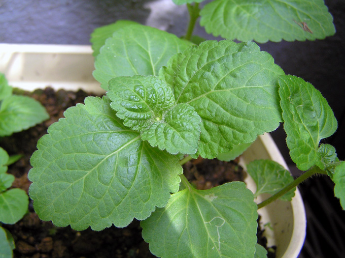 | 形態 | 基部から側枝が多数発生して、球状の姿になる。葉は先端が尖った円形~広卵形で、鋸歯があり、葉の両面に毛がある。葉は下の方は対生するが、枝の上部では互生する。5~11月頃、枝先に淡紫色の頭花が散房状につく。 |