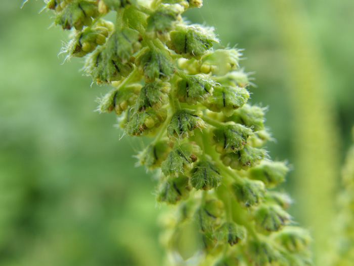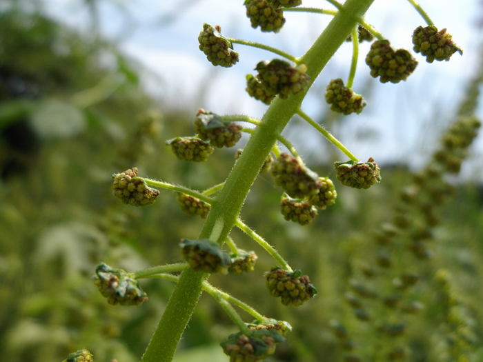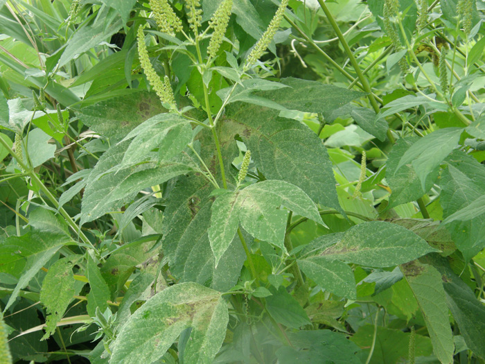 | 形態 | 分岐して大きな株になる。葉は長い柄があり、掌状に3~5裂し、鋸歯があり、対生する。葉の表裏ともざらつく。8~9月頃、茎の上部に雄花穂がつき、雌花は雄花穂の下部の葉腋につく。果実は偽果で、4~8個の突起がある。 |