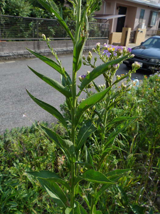| 形態 | 春先に数本の茎が直立して伸びる。葉は披針形で、鋸歯があるものと全縁のものがあり、互生する。茎葉には粗い毛が生える。9~10月頃、茎先に円錐花序を作り、頭状花を多数咲かせる。中央は黄色の筒状花で、舌状花が淡紫色。 |