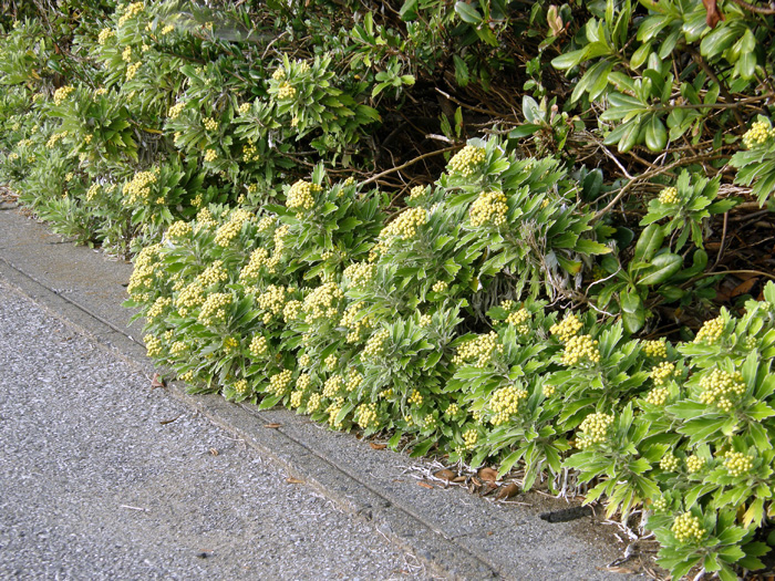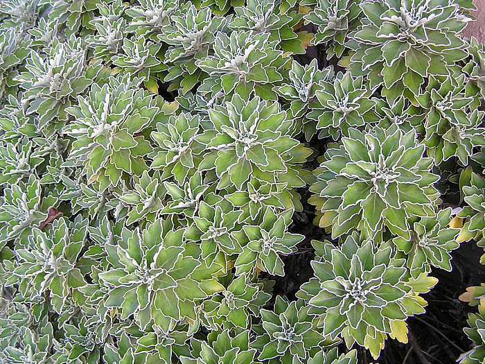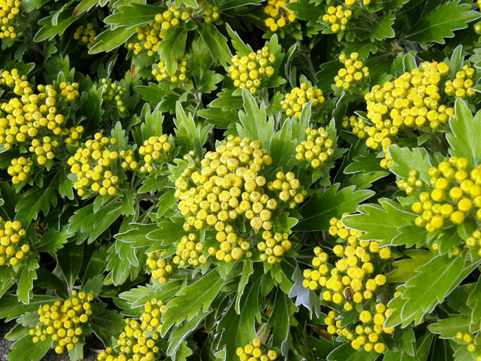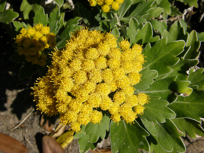 | 形態 | 平坦地では地下茎によって広り、カーペット状に生育する。葉は厚く、裏面~葉の縁には白毛が密生しており、表面から見ると葉が白く縁取られているように見える。10末~11月に、茎の先端に、散房状に小さな花が群がって咲く。舌状花はなく、黄色の筒状花のみ。 |
