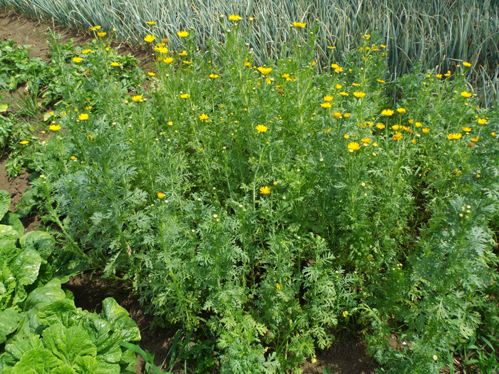 | 形態 | 葉には深い切れ込みがあり、独特の香りがある。6~7月に黄色い頭状花を咲かせる。花の中心部が黄色く、周辺がクリーム色の蛇の目模様の花を咲かせるものもある。 |