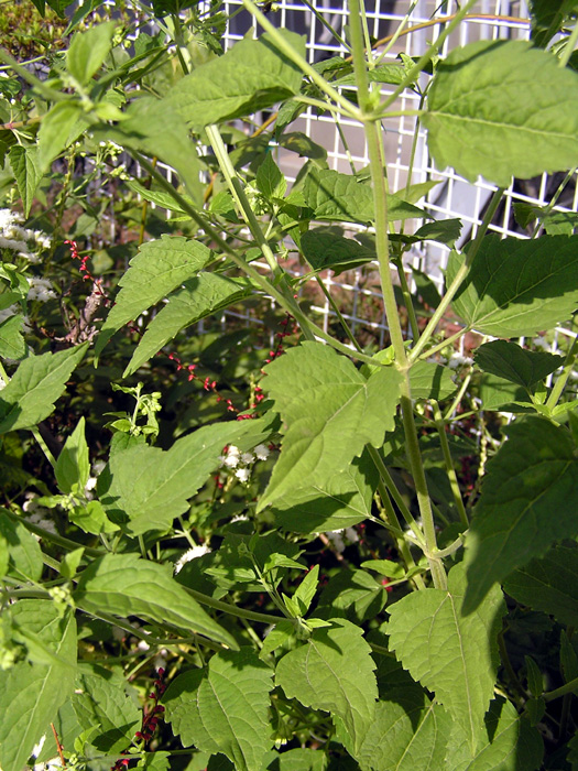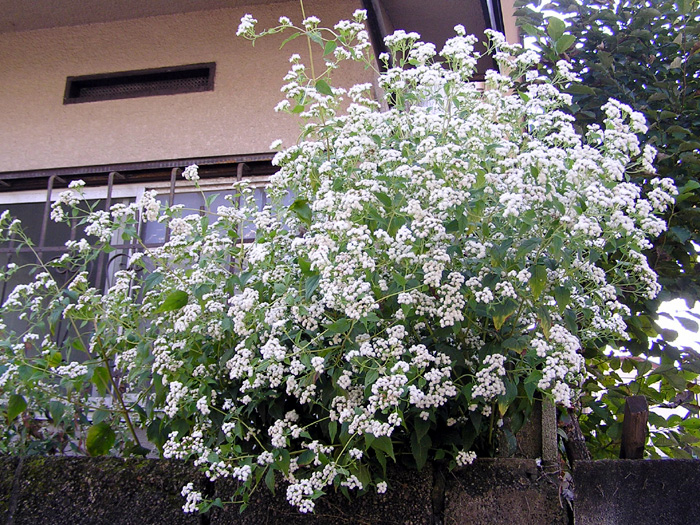 | 形態 | 地下に太くて長い根茎があり、群落を形成する。葉は卵形で長い柄があり、対生する。縁には粗い鋸歯がある。茎の上方で分枝して、9~10月に枝端に白色の頭花を多数つける。頭花は、20数個の筒状花から成る集合花で、筒状花から2本の花柱が長く飛び出す。 |