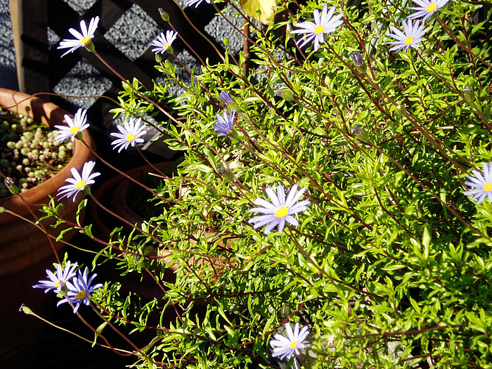| 形態 | 地際からよく分枝してこんもりとまとまる。茎は赤味がかる。葉は狭ヘラ形〜狭楕円形で、互生する。春と秋が最盛期だが、真夏を除くほぼ周年、長めの花柄の先に、鮮青紫色の舌状花と黄色の筒状花の頭状花を咲かせる。気温が低いと花弁が外側に丸まる。 |