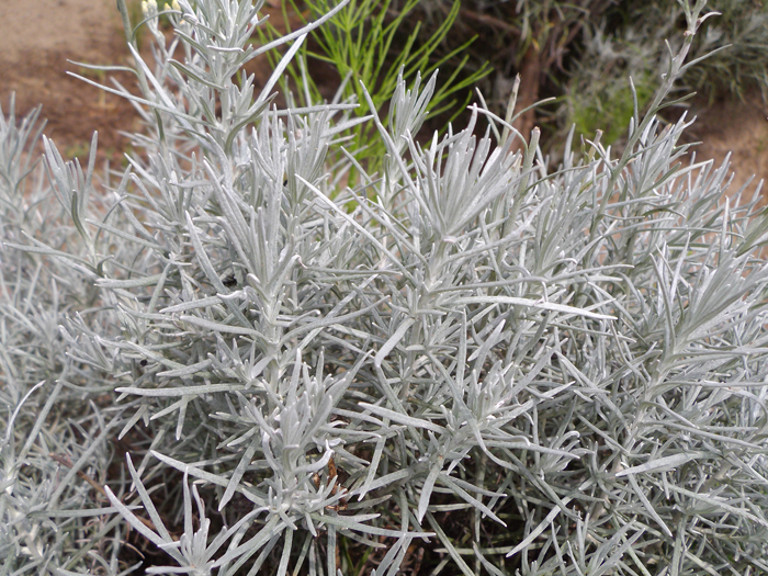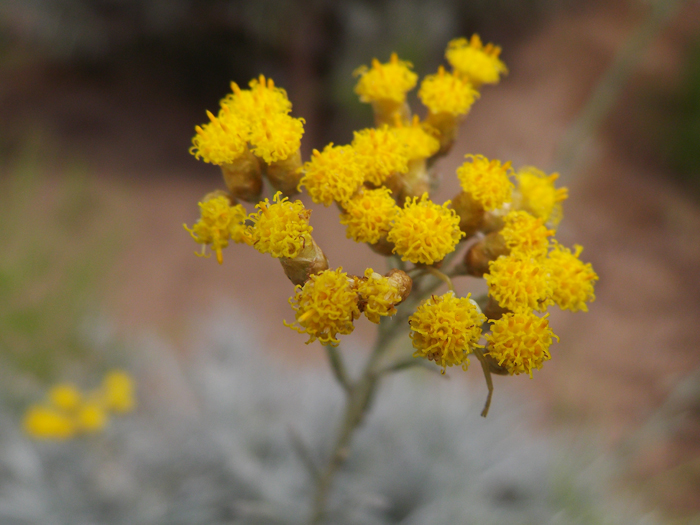 | 形態 | 茎は直立し、よく分枝する。若い茎は産毛に覆われるが、次第に木質化する。葉は披針形で、柔らかい毛に覆われた銀白色で、互生する。6~8月頃、茎頂に散房花序を作り、カサカサした黄色い筒状花だけの頭状花をたくさん咲かせる。果実は痩果。 |