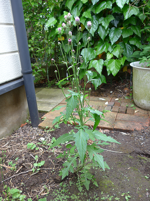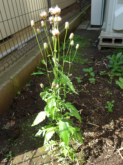 | 形態 | 秋に芽生えてロゼット状で越冬し、翌年の春~夏に茎を立ち上げる。葉は柔らかく、披針形で、互生する。葉は羽状に深裂するが、裂けないものもある。5〜6月頃、分枝した茎頂に頭状花を咲かせる。頭状花は紅紫色の筒状花のみで、舌状花は無い。果実は褐色で狭倒卵形〜長楕円形の痩果で、縦に溝があり、白い冠毛が2列につく。 |