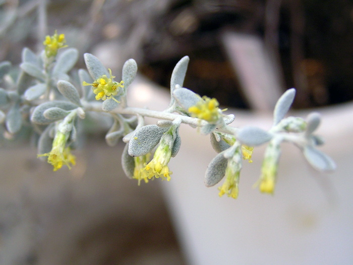 | 形態 | 株元からよく分枝する。若枝や葉は白緑色の軟毛で覆われ、全体がシルバーに見える。葉は楕円形で、互生する。葉は白緑色の軟毛で覆われるが、次第に軟毛が抜け落ち、緑色になる。6〜8月頃、黄色い花を咲かせる。果実は痩果。 |