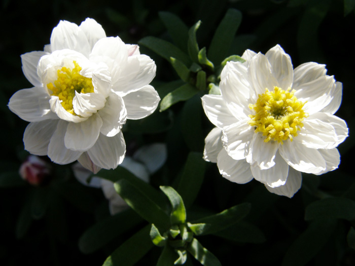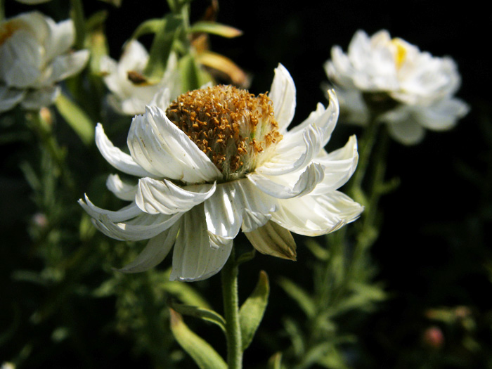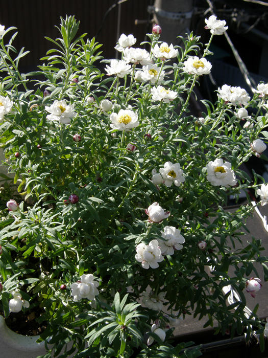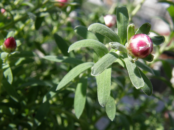 | 形態 | 株元からよく分枝する。細長い白緑色の葉は柔らかく毛羽立って、互生する。 3~5月に、枝先にひとつ、頭状花をつける。キク科だが舌状花はなく、黄色い筒状花を白いカサカサした総苞が取り囲む。総苞の外側は赤褐色を帯びる。「ペーパーカスケード」とよく似るが、「ペーパーカスケード」の花弁状の総苞が星型に尖るの対し、こちらは丸っこい。蕾も先端が丸い。 |