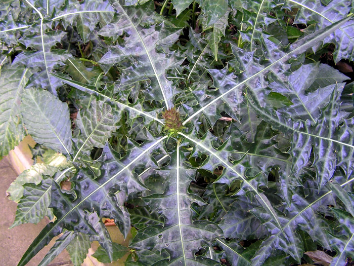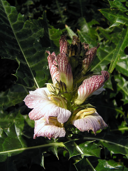 | 形態 | 葉は根生し、厚く光沢のある濃緑色で、葉脈は白っぽく、深い切れ込みがあり、粗く棘状の鋸歯があり、先端は触ると痛い。花茎を立ち上げ、穂状花序を作る。花はピンク〜淡紫色で、棘状の鋸歯がある萼が花の上に蓋のようにつき、花の下には棘状の鋸歯がある苞がある。果実は蒴果。 |