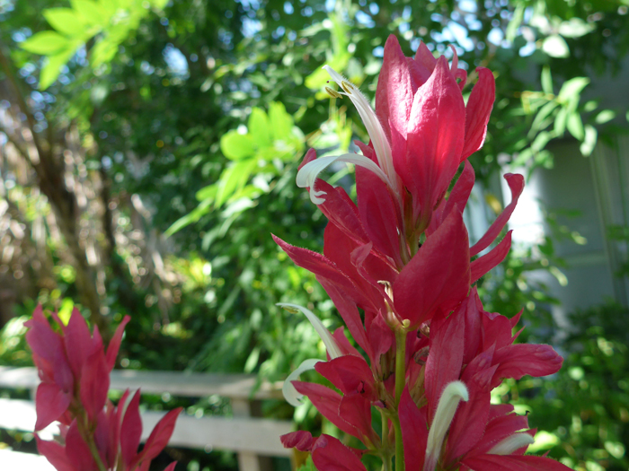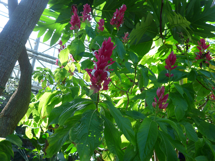 | 形態 | 茎は直立し、まばらに分枝する。葉は光沢のある緑色で、やや先の尖った楕円形で、全縁でやや波打ち、対生する。11〜2月頃、枝先に濃桃色〜赤色の苞片が目立つ円錐花序を作り、中から白~薄桃色の花を咲かせる。果実は蒴果。 |
