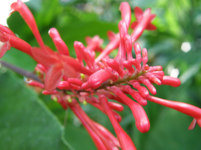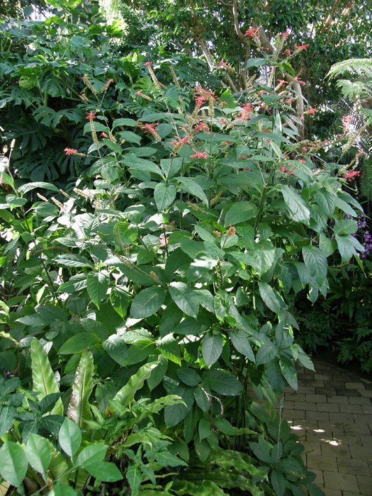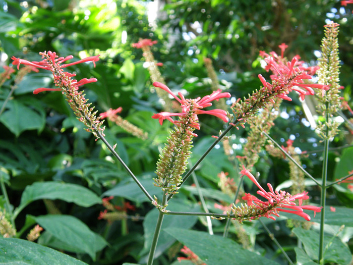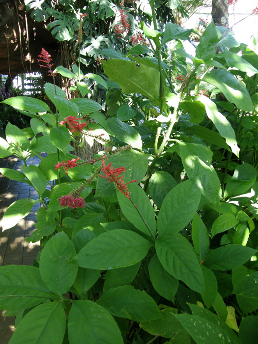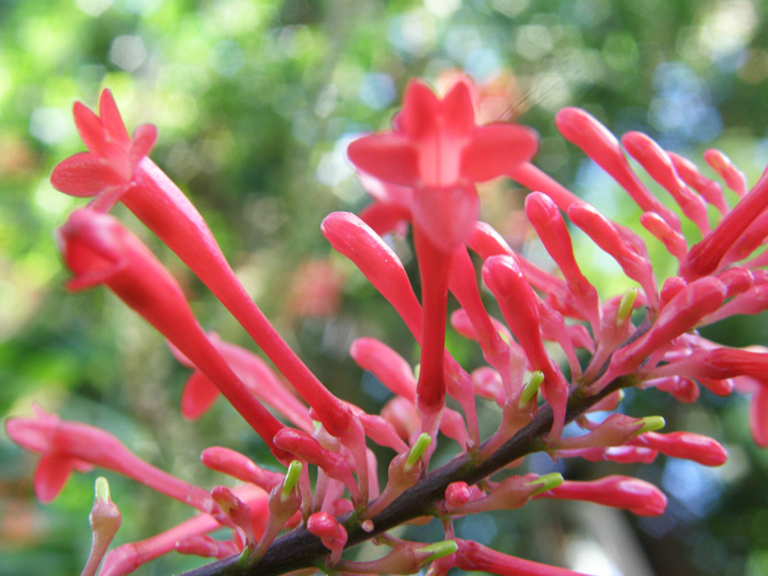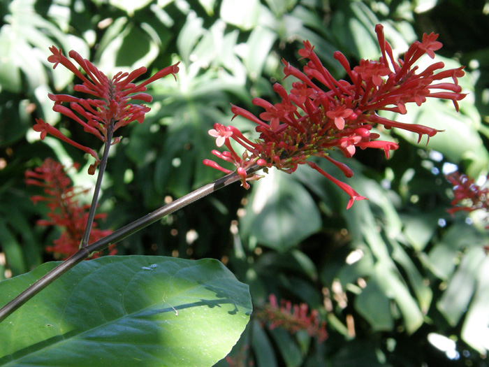 | 形態 | 茎は直立し、まばらに分枝する。葉は光沢のある濃緑色で、全縁の先の尖った長楕円形で、対生する。夏の終わり~冬に、枝先や葉腋に円錐花序をつけ、鮮やかな赤い筒状の花を咲かせる。 |